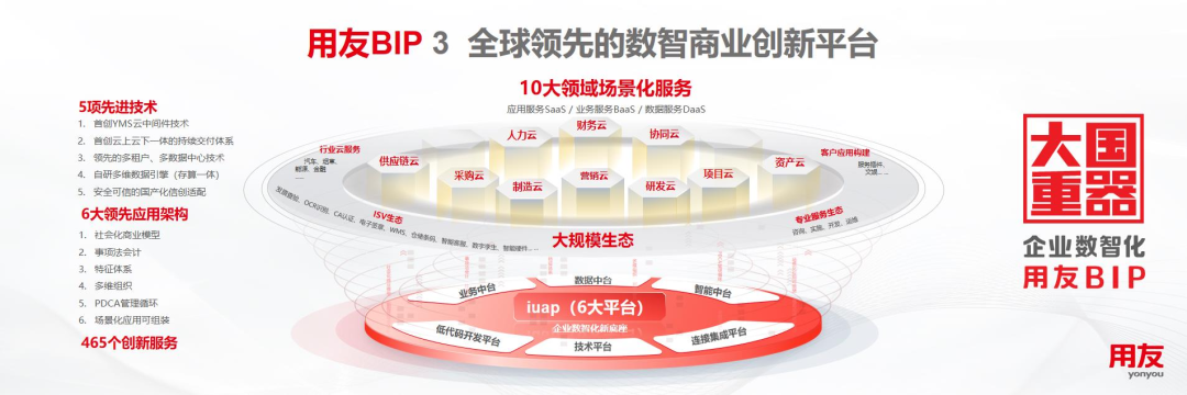面對難得的市場和產(chǎn)業(yè)發(fā)展機遇,用友經(jīng)過6年的規(guī)模研發(fā)、持續(xù)迭代,以全新理念、全新技術(shù)、全新架構(gòu)、全新模式打造了面向企業(yè)和公共組織數(shù)智化的全新一代產(chǎn)品——用友BIP,并在平臺技術(shù)、應用架構(gòu)、創(chuàng)新服務等方面實現(xiàn)多項重大突破與升級,達到全球水平,包括5項技術(shù)、6大應用架構(gòu)、465項創(chuàng)新服務,覆蓋智能財務、數(shù)智人力、數(shù)智采購、數(shù)智營銷、智能制造、數(shù)智供應鏈、數(shù)智研發(fā)、數(shù)智項目、數(shù)智資產(chǎn)及協(xié)同工作等十大核心領(lǐng)域,是目前全球領(lǐng)域覆蓋較多的企業(yè)云服務群。
